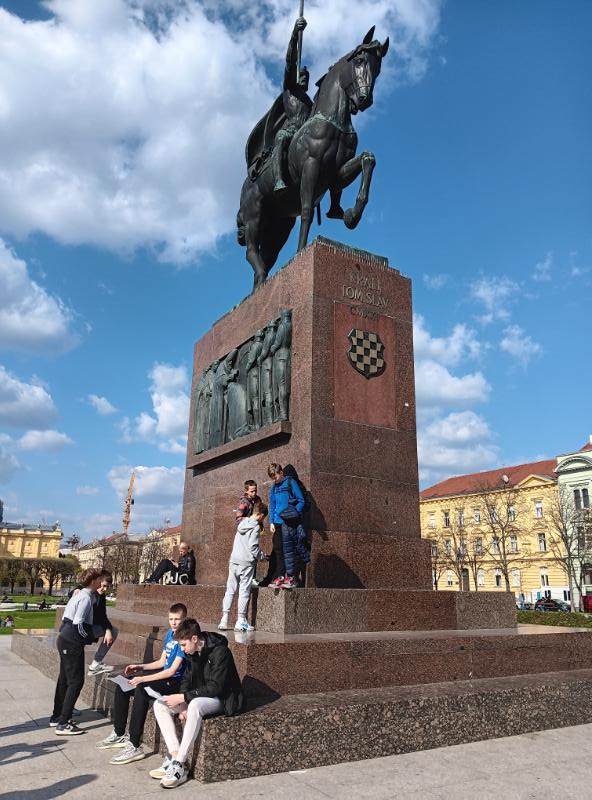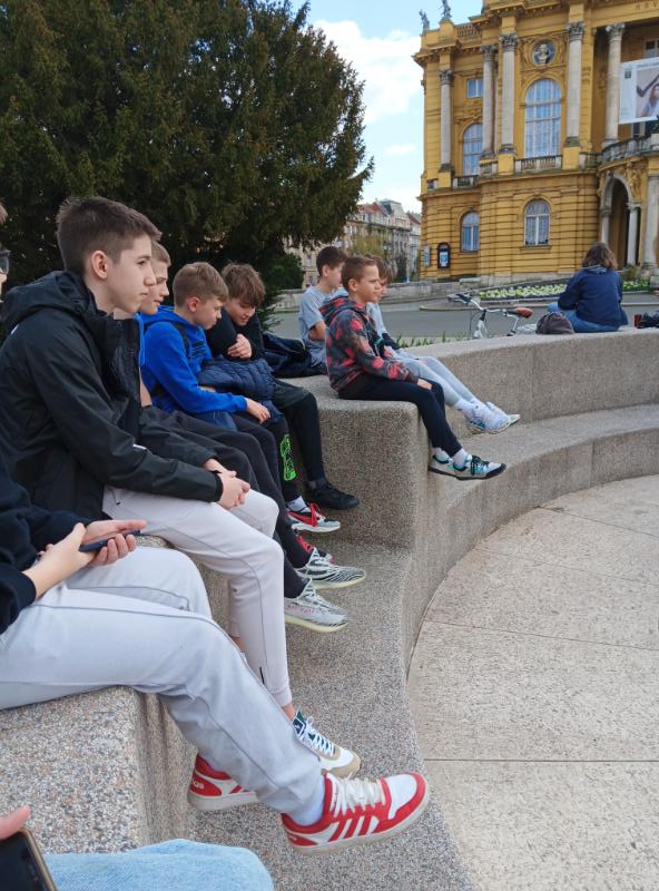 Prije Zrinjevca, na Strossmayerovu trgu, trebali smo još jedan predah. Dvojica učenika ipak se nisu odmarala te su nas iscrpno informirali o povijesti Hrvatske akademije znanosti i umjetnosti.